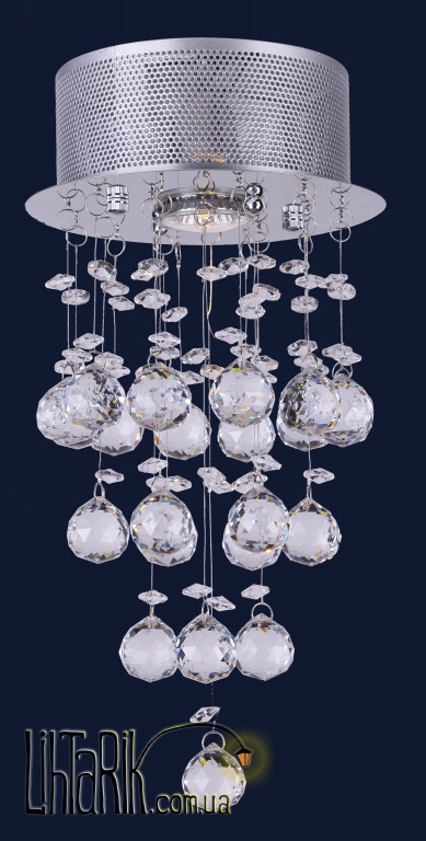 Припотолочная люстра с хрустальными подвесами впишется в любую дизайнерскую среду. Светильник изготовлен из металла, стекла, хрусталя высокого качества