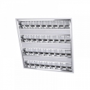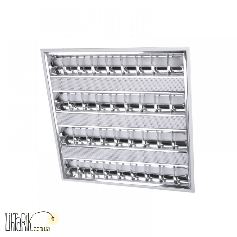 Растровый люминесцентный светильник с корпусом из литого алюминия. Решётка предназначена для того, чтобы отражать и рассеивать свет, а так же для защиты ламп от выпадения и случайных механических повреждений. Светильник рассчитан на 4 люминесцентные линейные лампы. Подобные светильники обычно используются для освещения нежилых помещений: офисов, торговых залов, вестибюлей и т.д., реже - для освещения жилых помещений. Свет люминесцентных ламп не так ярок, как свет от ламп накаливания, что компенсируется большей площадью излучающей поверхности. Свет люминесцентной лампы по спектру похож на дневной, что позволяет так же хорошо различать цвета предметов, как при естественном освещении. Рабочая температура таких ламп близка к температуре окружающей среды. Люминесцентные лампы бывают разных оттенков: от холодных бело-голубых до тёплых, жёлтых тонов. Это зависит от люминофора, который используется в конкретной лампе. Использование светильников с такими лампами оправдано и с финансовой точки зрения: при одной и той же светоотдаче, люминесцентные лампы потребляют в 4-5 раз меньше электроэнергии, чем лампы накаливания, а их срок службы составляет до 18 000 часов.