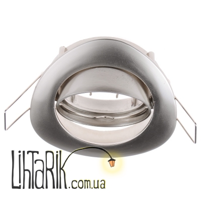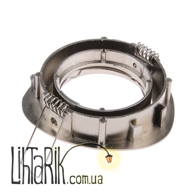 Изготовлен из алюминия, окрашен в цвет перламутровый никель, поверхность украшена узором. Лапки-держатели изготовлены из никеля, прочные, не ломаются, надежно держат светильник в специальном отверстии. Для работы необходимо использовать одну галогенную рефлекторную или светодиодную лампу с цоколем GU5.3, мощностью 20 Вт. Рассчитан для работы от сети 12 В, нужен трансформатор.