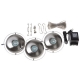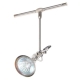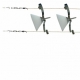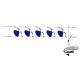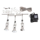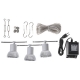 Струнная система светильников из пяти светильников приплюснутой формы с плафонами из белого матового стекла. Они устанавливаются на специальные металлические тросы, которые ещё называют струнами, при помощи особых креплений. Благодаря шарнирам, на которых крепится плафон, его можно вращать в одной плоскости. Так можно направлять свет, если вы, например, хотите сфокусировать свет нескольких светильников в одной точке или наоборот - рассеять его по определённой площади. В комплекте поставляются галогенные капсульные лампы. От обычных ламп накаливания они отличаются тем, что их баллон заполнен особым буферным газом, позволяющим повысить температуру спирали. Благодаря этому, галогенные лампы горят ярче своих обычных «коллег» при той же номинальной мощности. Использование таких газов также продляет срок службы лампы. Поэтому галогенные лампы считаются более экономными. Отличаются они и качеством освещения: предметы, освещённые галогенными лампами, кажутся ярче, контрастней. В комплект входят также пятиметровый шнур, трансформатор и струны.
