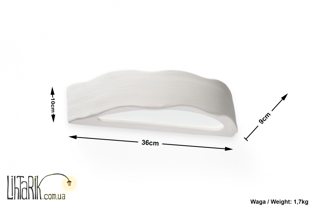 Патрон: E27, 1 x max. 60W, 50 Hz, 220V, IP20. Лампы не в комплекте. Размеры: 10 x 36 x 9 cm Материал: керамика Цвет: белый Бра можно покрасить любыми красками для стен..