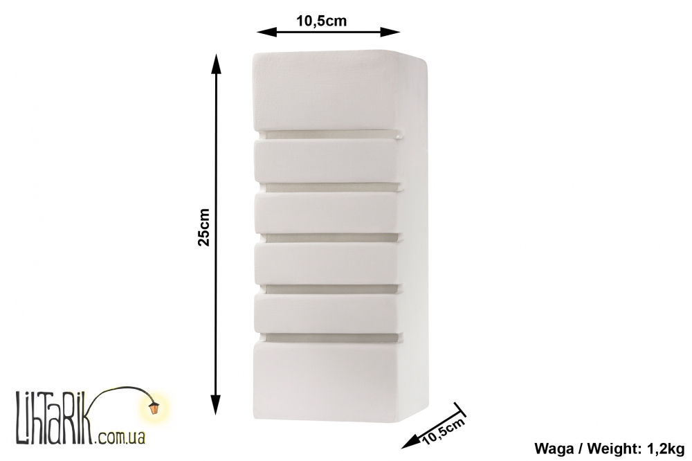 Патрон: E27, 1 x max. 60W, 50 Hz, 220V, IP20. Лампы не в комплекте. Размеры: 25 x 10,5 x 10,5 cm Материал: керамика/стекло Цвет: белый Бра можно покрасить любыми красками для стен..