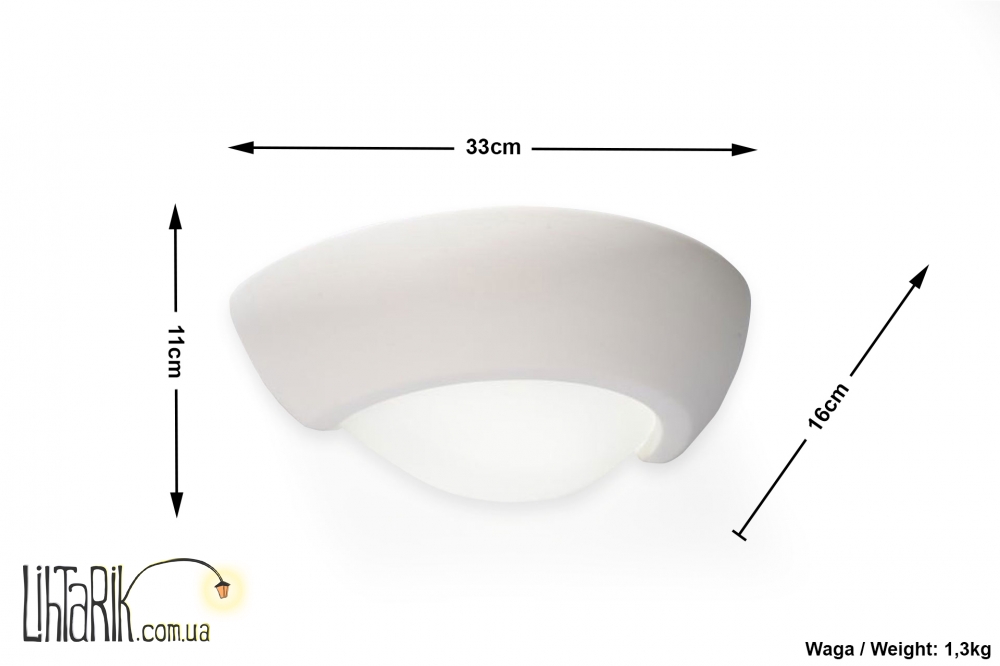 Патрон: E27, 1 x max. 60W, 50 Hz, 220V, IP20. Лампы не в комплекте. Размеры: 11 x 33 x 16 cm Материал: керамика Цвет: белый Бра можно покрасить любыми красками для стен..