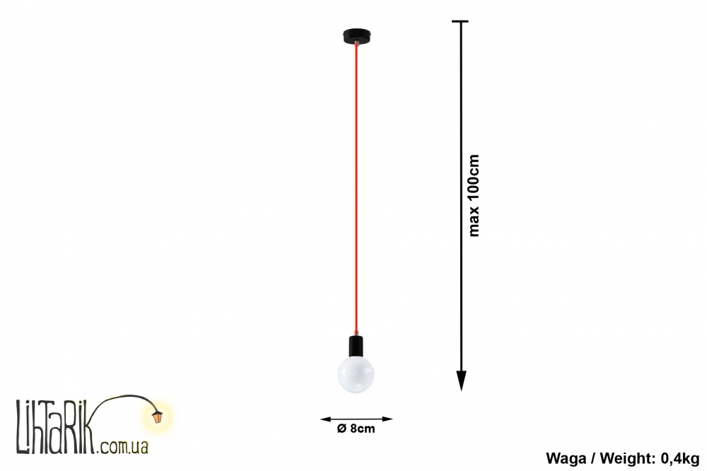 Патрон: E27, 1 x max. 60W, 50 Hz, 220V, IP20. Лампы не в комплекте. Размеры: 8 x 8 x max. 100 cm Материал: металл, плетёный провод Цвет: Pomaraczowy
