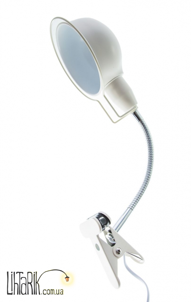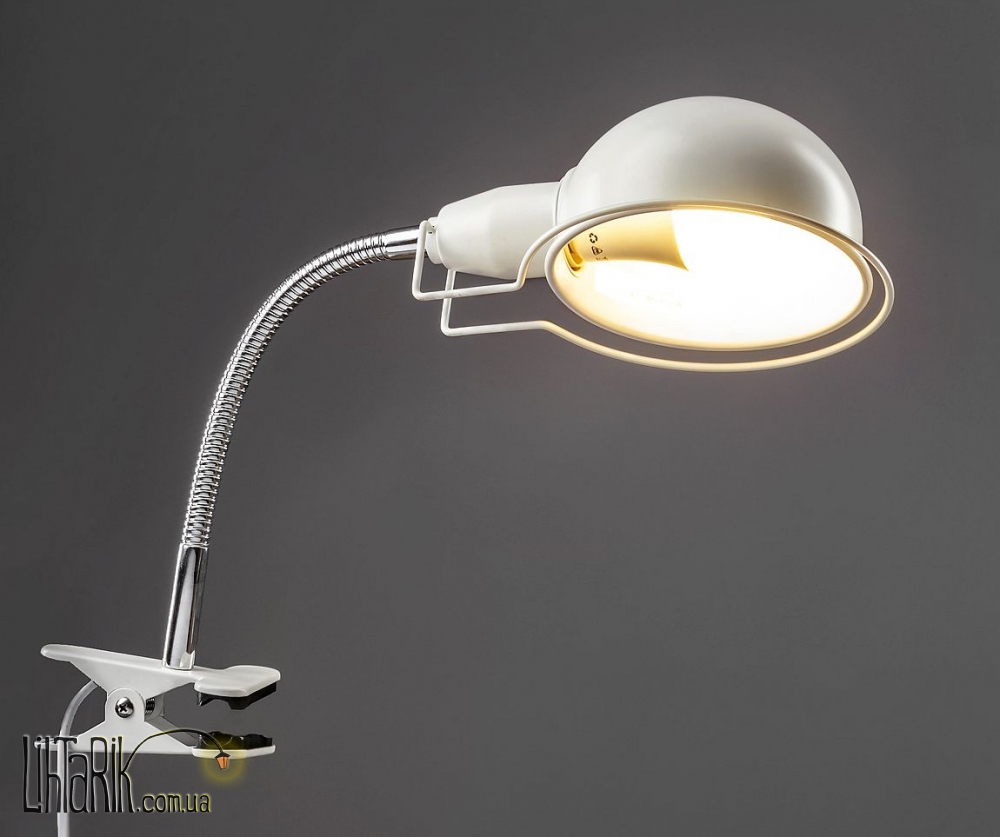 Jednopomienna lampka biurkowa. Lampa-klips matowo-biaa, metalowy odcie, chromowana metalowa rura mikka. Dziki regulowanemu reflektorkowi istnieje moliwo skierowania strumienia wiata w dowoln stron. Owietlenie idealnie sprawdzi si w pracowniach, biurach, jak i pokojach modzieowych i dziecicych.