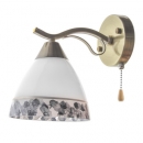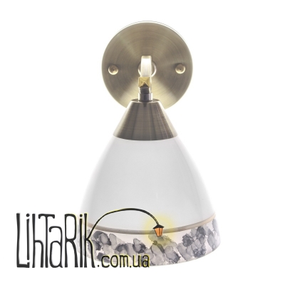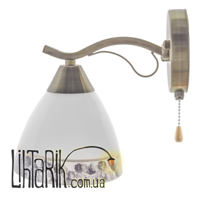 Для любителей минимализма в оформлении интерьера помещения, для тех, кто предпочитает ощущать себя свободно и легко в собственном доме, специально для таких людей дизайнеры изготовили бра LK-611W/1 E27 AB/BL . Данное бра изготовлено из металла и стекла. Конструкция представлена небольшим металлическим каркасом цвета старое золото, к которому прикреплен один стеклянный плафон. Плафон выполнен в форме перевернутой чаши, белого цвета, декорирован разноцветным узором. Для работы необходимо использовать одну лампочку с цоколем Е27 мощностью 60 Вт (накаливания, энергосберегающая, светодиодная). Дополнительно светильник оборудован цепочкой-выключателем.