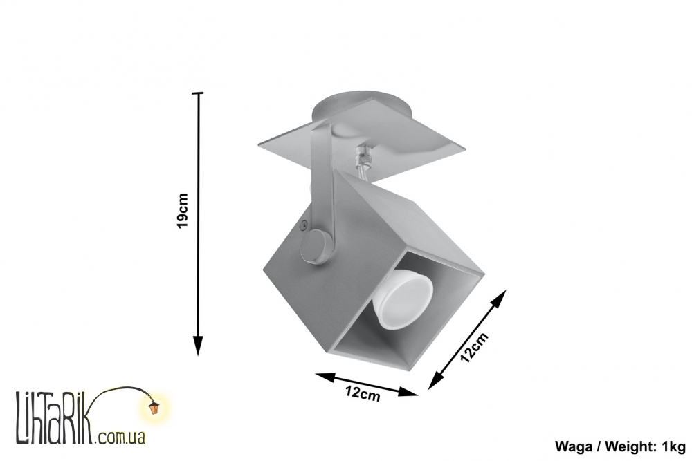 Патрон: GU10, 1 x max. 40W, 50 Hz, 220V, IP20. Лампы не в комплекте. Размеры: 12 x 12 x 19 cm Материал: металл/алюминий Цвет: серый