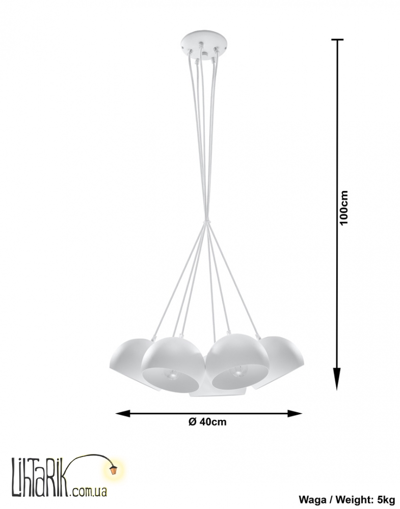 Патрон: E27, 5 x max. 60W, 50 Hz, 220V, IP20. Лампы не в комплекте. Размеры: 40 x 40 x max. 100 cm Материал: металл Цвет: белый
