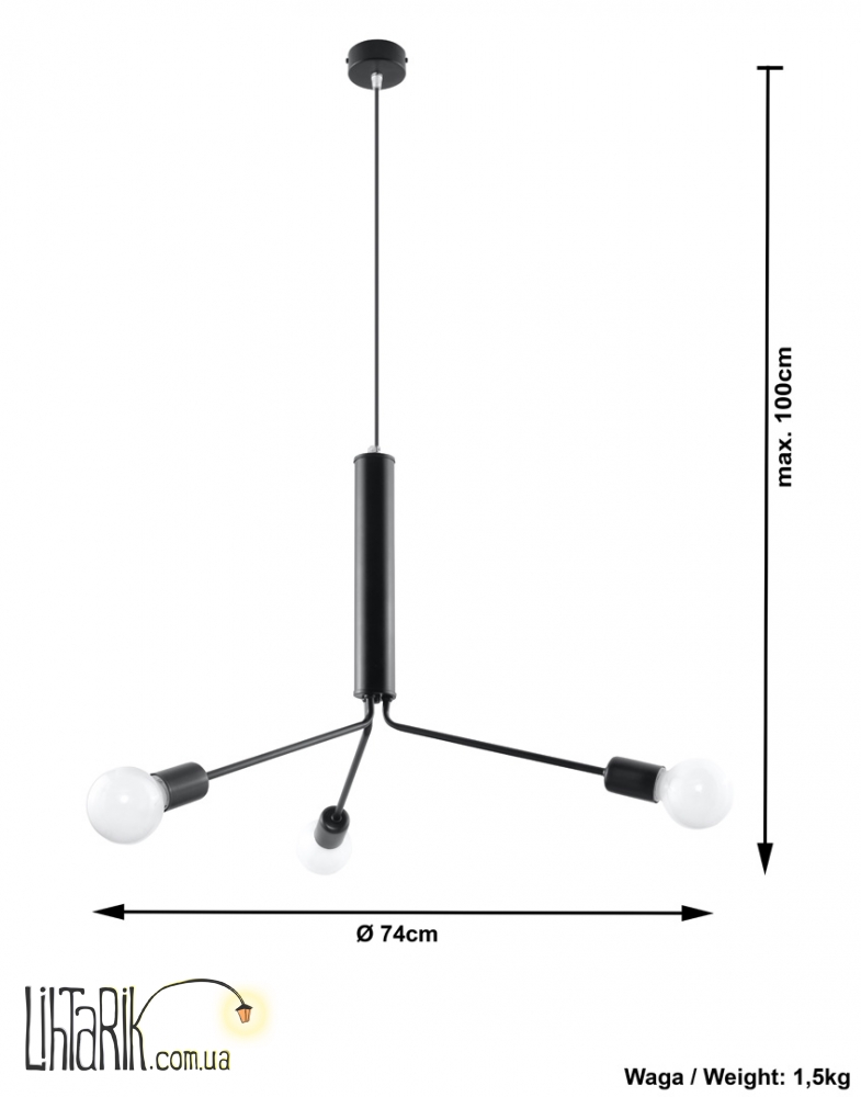 Патрон: E27, 3 x max. 60W, 50 Hz, 220V, IP20. Лампы не в комплекте. Размеры: 74 x 74 x max. 100 cm Материал: металл Цвет: чёрный