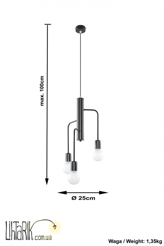 Патрон: E27, 3 x max. 60W, 50 Hz, 220V, IP20. Лампы не в комплекте. Размеры: 25 x 25 x max. 100 cm Материал: металл Цвет: чёрный