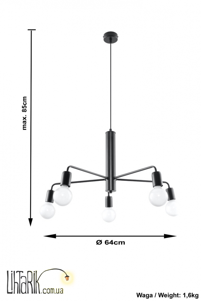 Патрон: E27, 5 x max. 60W, 50 Hz, 220V, IP20. Лампы не в комплекте. Размеры: 64 x 64 x max. 85 cm Материал: металл Цвет: чёрный